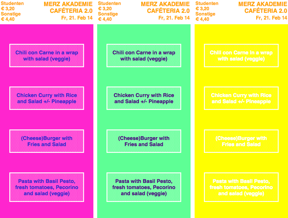 every refresh of the page from a set of arrays. we implemented a mousewheel and arrow key flipping navigiation where only one meal per canvas is shown to enjoy the variety